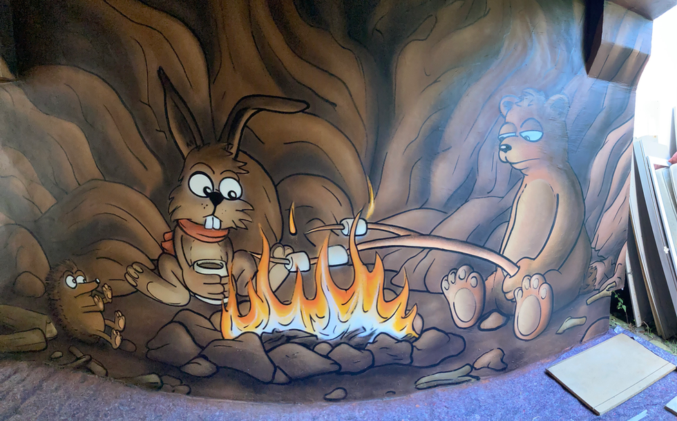 Im August 2025 gestaltete ich mit einem Team eine Hausfassade in Atona Nord. Hierfür entwarf ich ich lustiges Landschaftsmotiv mit Comic-Tieren in einem Birkenwald und in einer Tropfsteinhöhle.